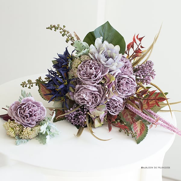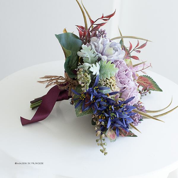 海外ウエディングに人気の茎が見えるタイプのブーケ。使用しているアーティフィシャルフラワーは特殊なくすみ加工が施されております。