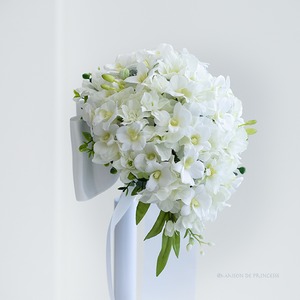 美しく繊細なデンファレの花びらを一枚いちまい丁寧にワイヤリングしてお作りしたティアドロップブーケ。隙間から見える可愛らしいブルーの小花をアクセントに。