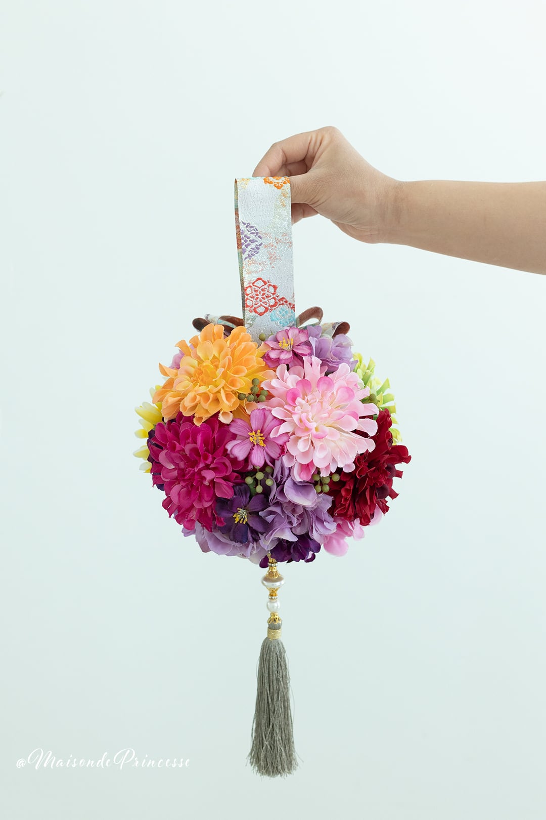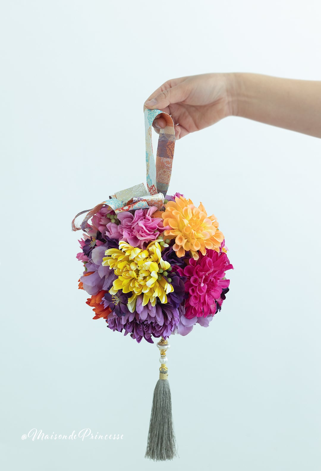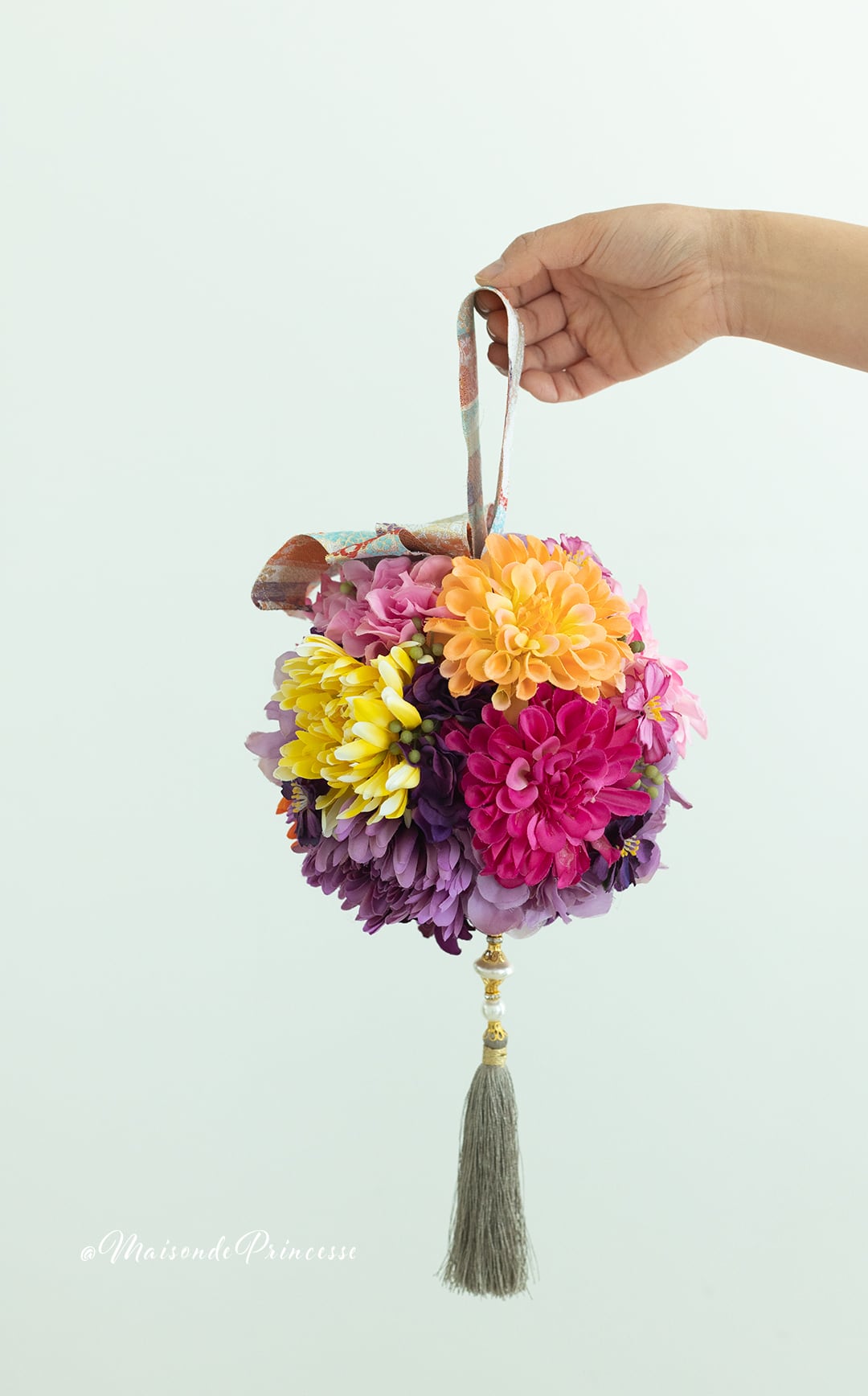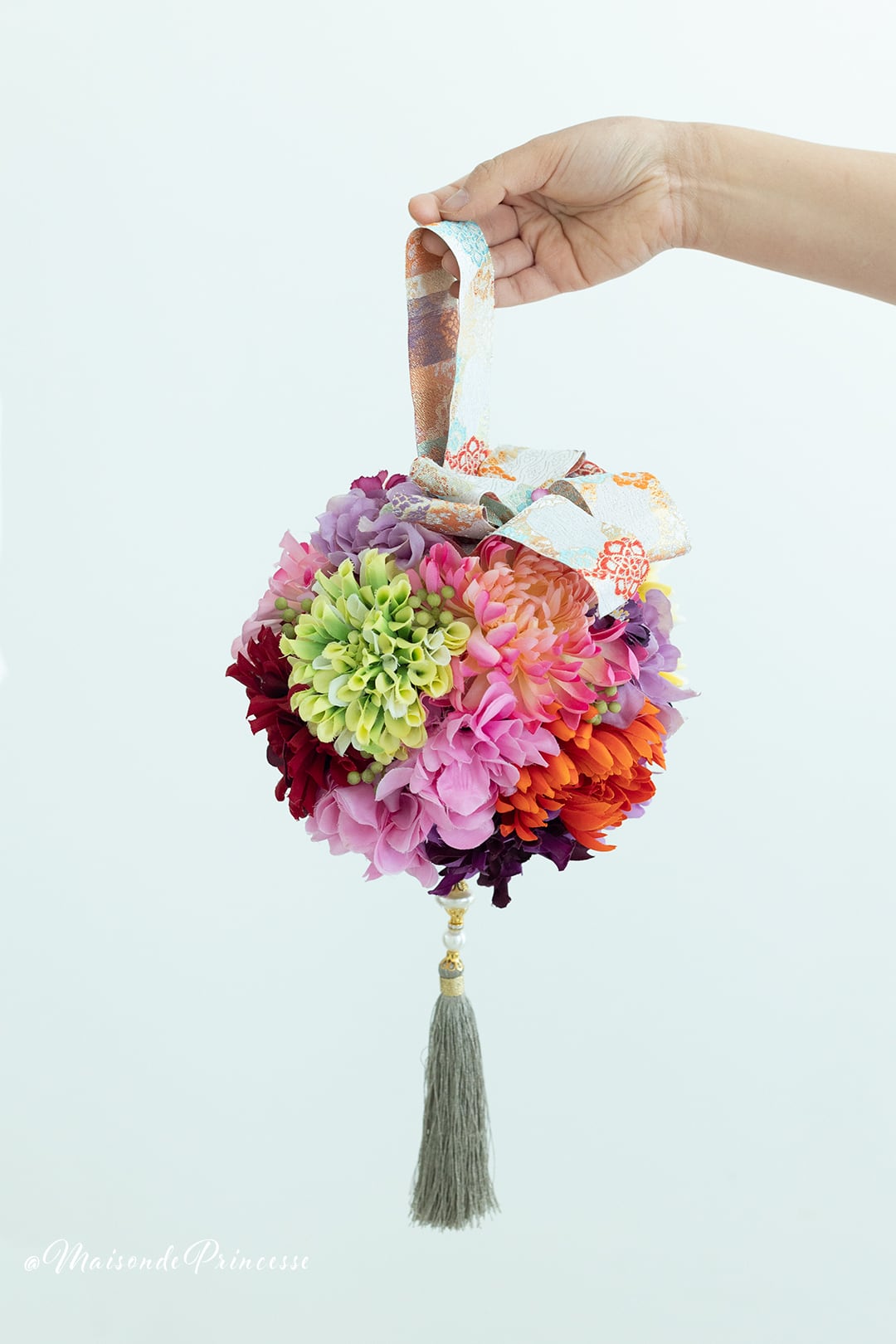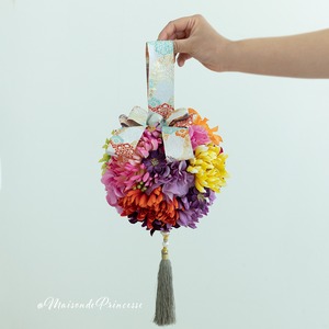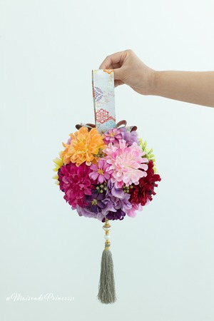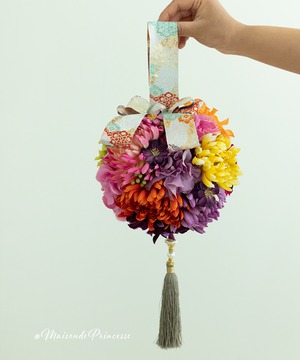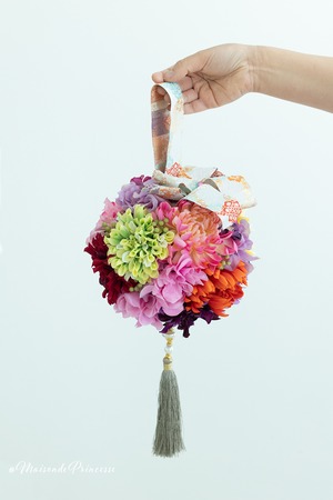 Maison de princesseがご提案する着物用のブーケは、歩くたびに揺れ動く手毬デザインブーケ。高級感溢れる色合いの和風ブーケは、伝統の和装挙式をおしゃれに演出。洋風ドレスにも合うデザインとなります。