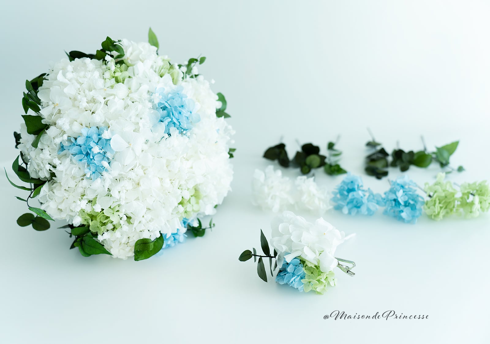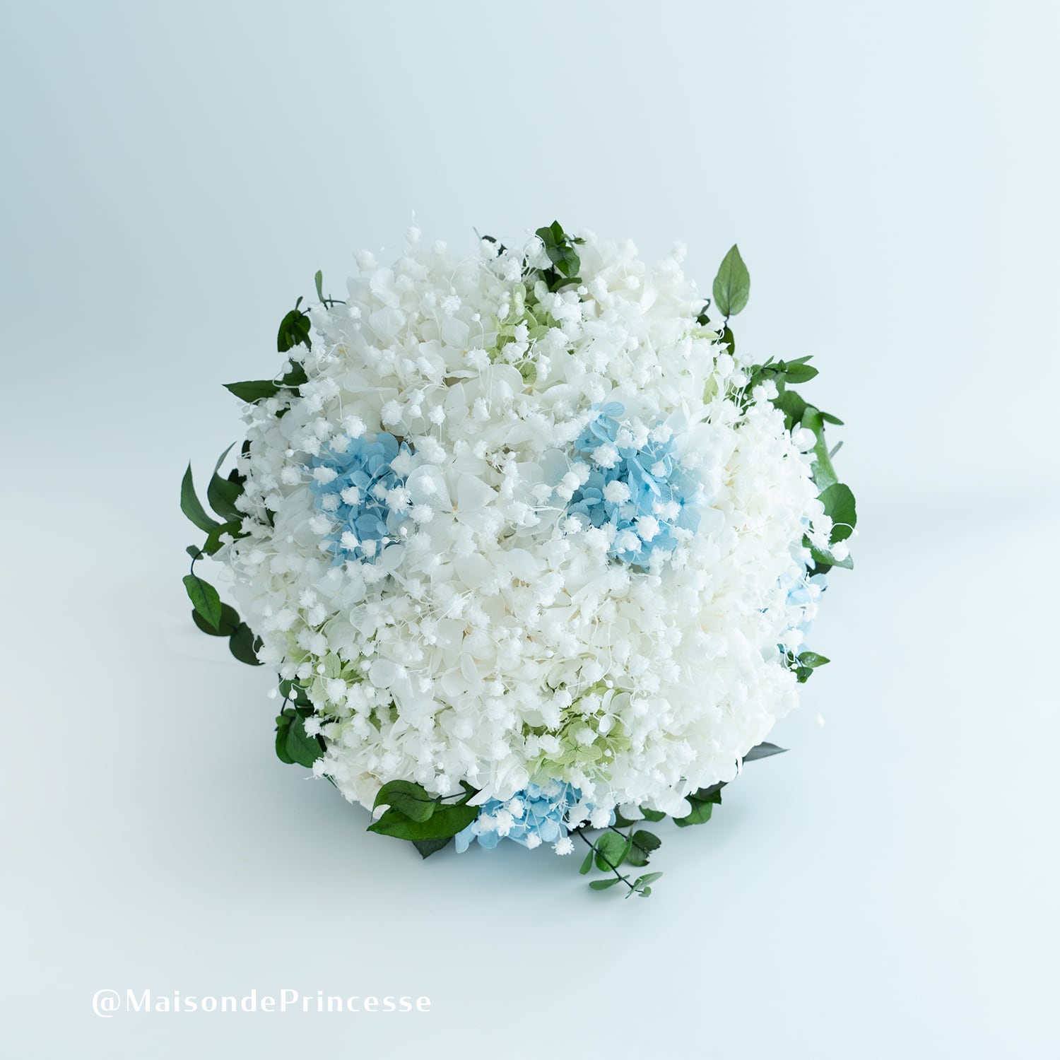 純白のドレスに映えるプリザーブドフラワーでお作りしたかすみ草・紫陽花・ユーカリを使用したラウンドブーケ。どんなドレスにも合う柔らかな印象を演出するブーケは、幸福感・ナチュラルリラックス感・特別感をもたらします。