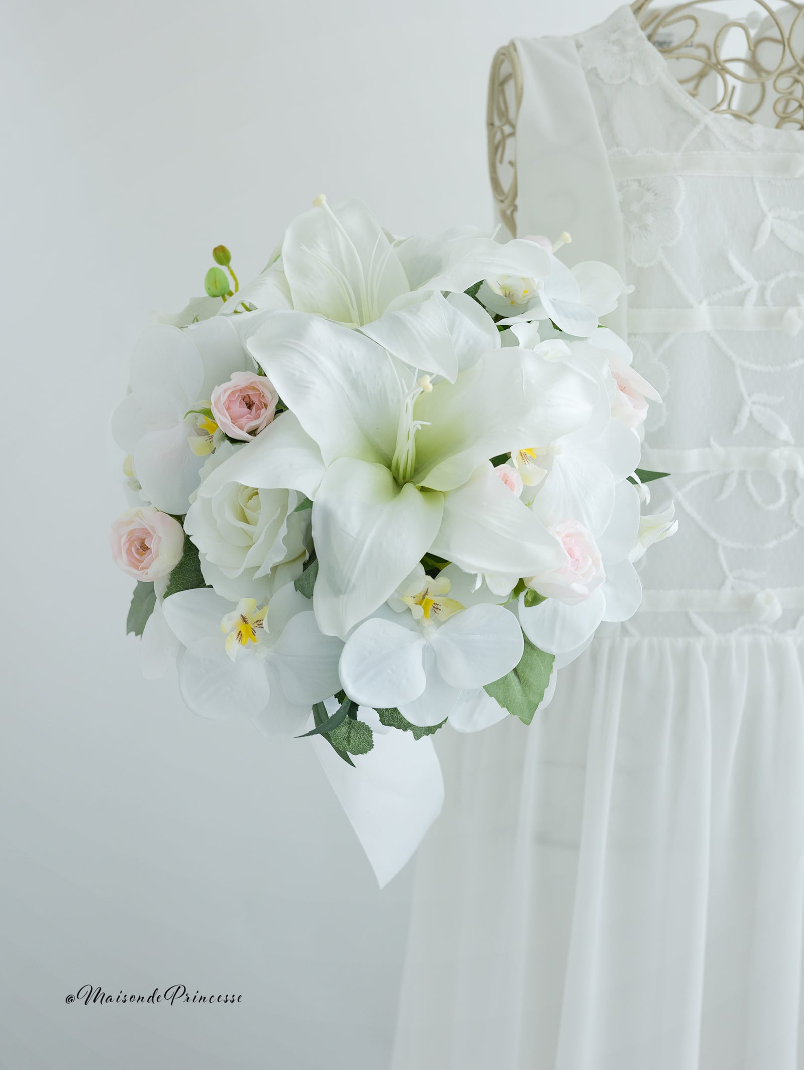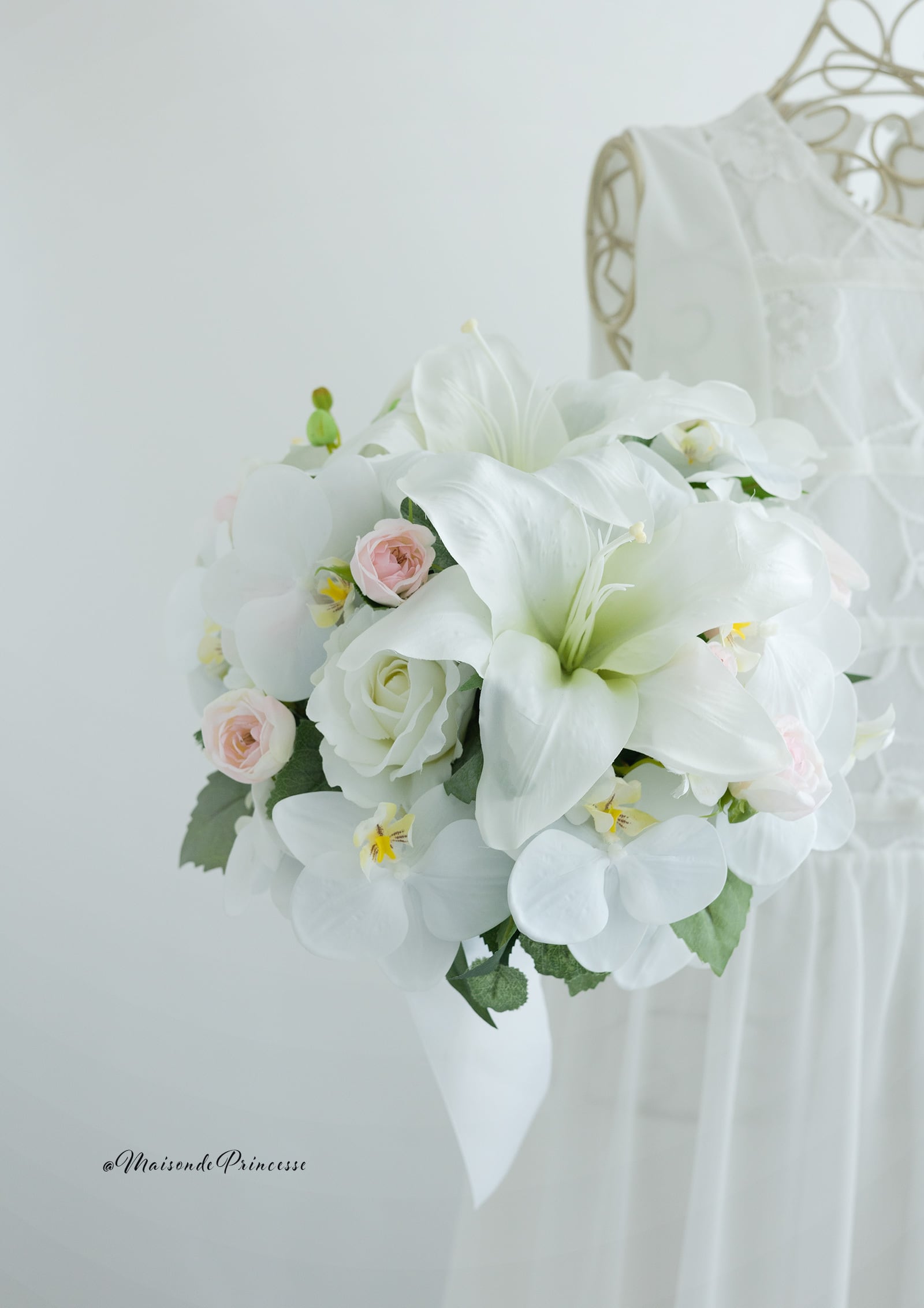 純白のドレスに似合う、正統派ウェディングブーケ。